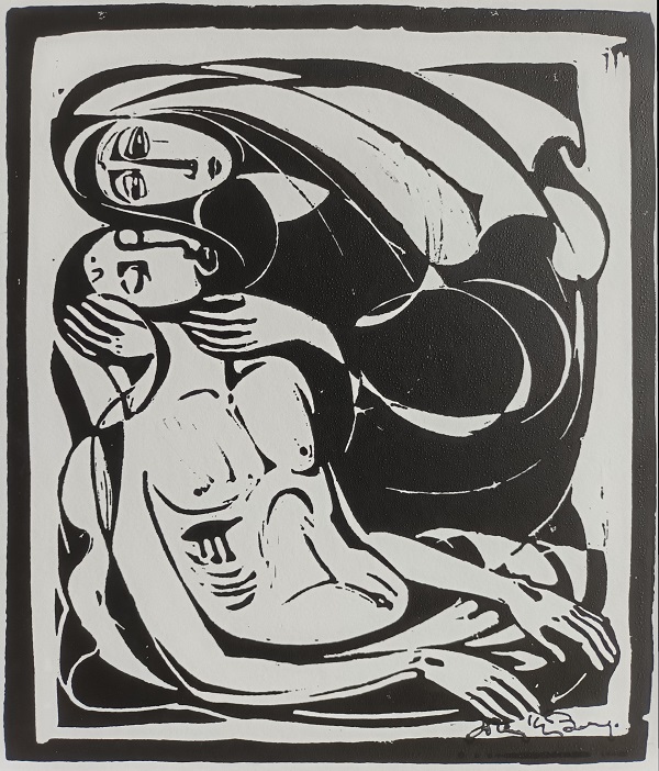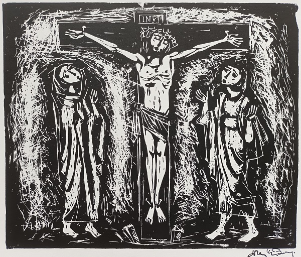 Ook te koop zijn de lino’s van de Hofstraat in Thorn (14 x 24 cm, 20 euro), Maria en Maria Magdalena onder het kruis (25 X 30 cm, 40 euro), de kleine prent Zomer aan de Heelderpeel (10 x 7 cm, 20 euro), een Piëta (25 bij 21 cm, 40 euro) en een Zelfportret uit 1962. In de kleine prent Heelderpeel portretteert Frans zijn vriend en collega Toon Klaver met zijn onafscheidelijke pijp. Het zelfportret is een detail van het affiche dat Frans in 1962 gemaakt heeft voor zijn tentoonstelling in het toenmalige gemeentehuis, nu het Kunsthuis Thorn. Die prent is 30 bij 22 cm en kost 40 euro.