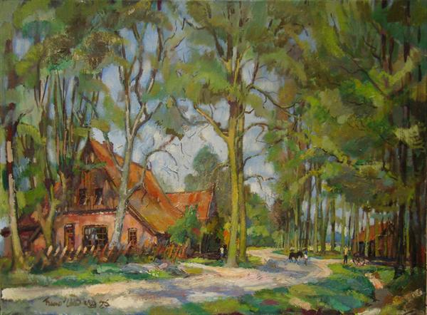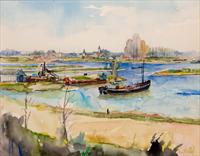 De grindwinning in de Maas en haar uiterwaarden heeft het Middenlimburgs landschap ingrijpend veranderd. Frans van den Berg heeft dat veranderende landschap meermalen geschilderd. Zoals in deze aquarel, die een gebied ten noorden van Wessem laat zien, met zicht op Heel.