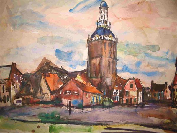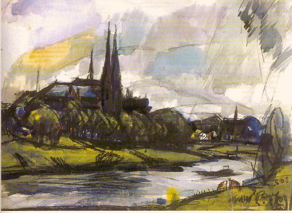 De markante torens het klooster-kerken complex aan de oostkant van de Maas, bij Tegelen, zijn door Frans van den Berg meermalen geschilderd. Dit aquarel portretteert een regenachtige dag.