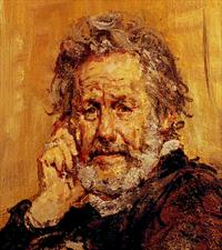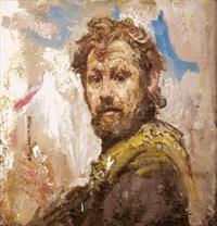 Een klassieke pose voor een zelfportret: de schilder met zijn gereedschap, een penseel, potlood of, zoals hier, met een houtskooltje, waarmee hij de eerste contouren van het schilderij gaat opzetten.
